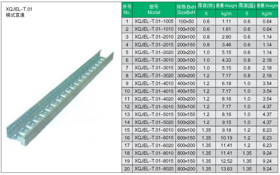 XQJEL_T.05梯式垂直上彎通產(chǎn)品型號(hào)、規(guī)格、重量等參數(shù)及XQJEL_T梯式電纜橋架在不同跨距下允許均布載荷變形量。