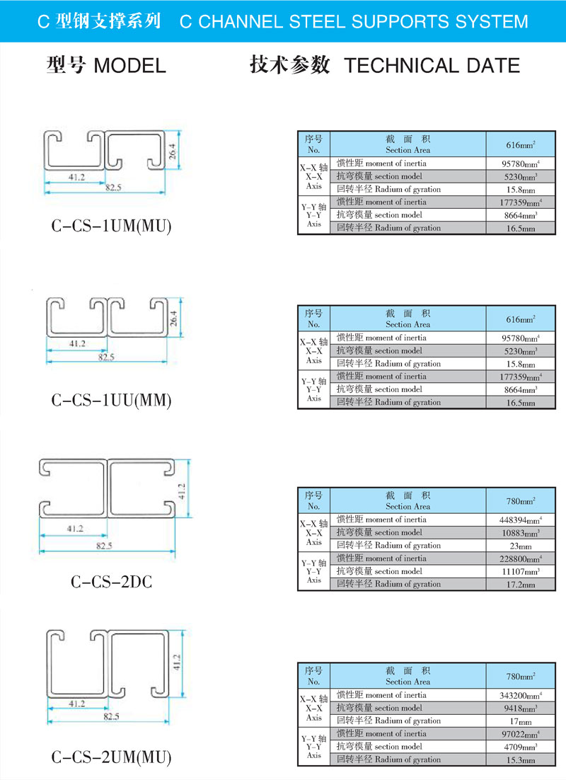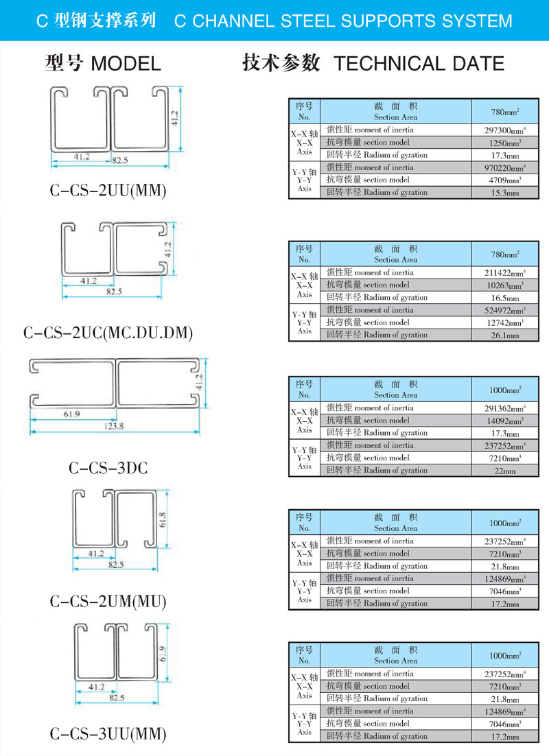 C型鋼支撐系列是我公司引進國外先進技術工藝,開發的產品。也是目前國際上廣泛應用的支撐件。具有結構合理、安裝靈括、強度可靠等優點。可任意調節支撐的高度及問距。適合于電纜橋架、通風管道等各種患掛、吊裝設備的安裝 。